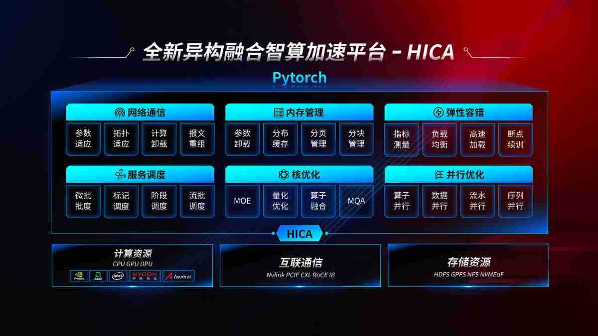 通过自研的服务层、、、中间适配层、、以及调度编排算法,,,采用数据并行、、、、模型并行等多种并行方式,,,,把并行计算任务进行有效的分解,,,,使其分别由相应的软件栈和算力资源来承接。。。当GPU资源变化,,HICA可以实时动态调度计算子任务并调整模型拓扑和架构,,,以充分聚合各种算力资源。。